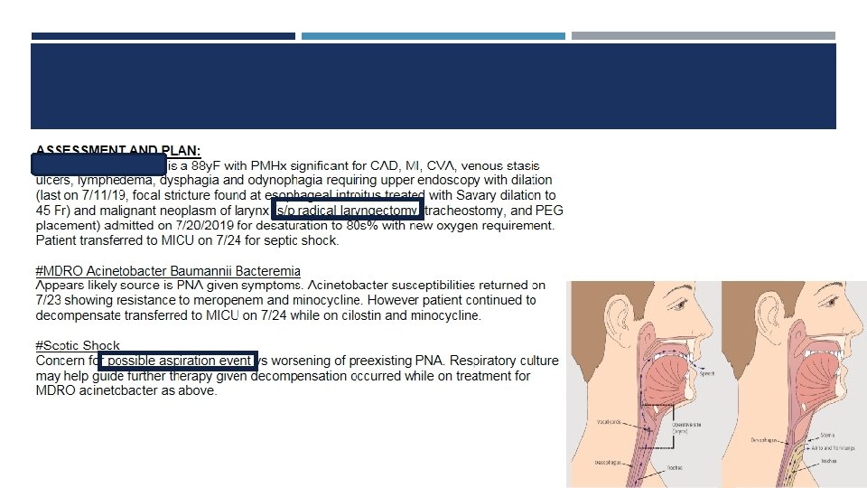 PO INTAKE AFTER TRACH • Many patients will aspirate on VFSS test with new tracheostomy • Often easier for patient to eat once trach is downsized or cuff is deflated • Decannulation, capping, or PMV should be attempted in patients w/ trach to help with aspiration • Speech pathology will help in rehabilitation