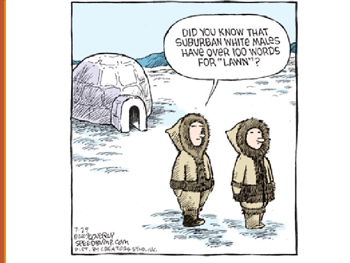 The number of words skyrockets Martin (1986) ” 3” Brown 1958 “ 3 Eskimo words for snow” “Many” Eastman 1975 “ 50” Langford Wilson 1978 play “The Fifth of July” “ 9” The Straight Dope. Compendium. 1984. “ 100” 1984 New York Times “ 200” WEWS-Cleveland 1984 broadcast