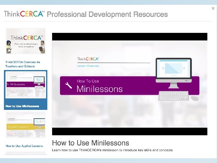 Think. CERCA features Mini Lessons ● Rich visuals with text ● Audio recordings of content (a real person) ● formative assessments of content What is in a mini lesson.
