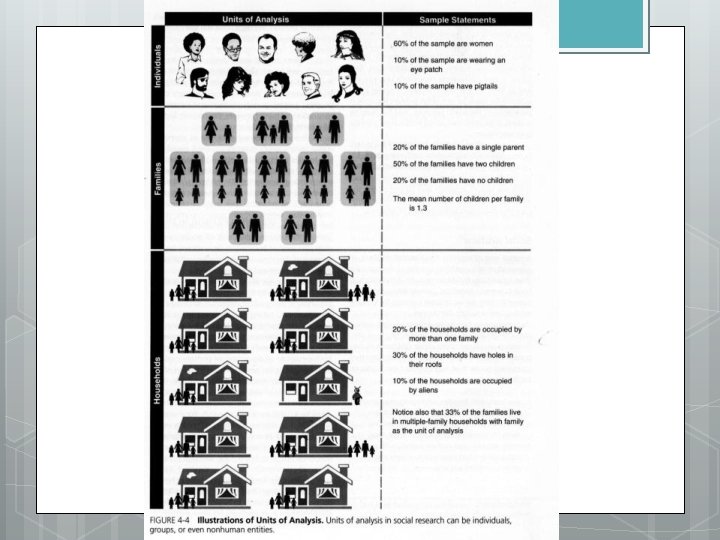 Units of Analysis Activity A. Though 667, 000 out of 2 million farmers in the US are women, women historically have not been viewed as farmers but rather as the farmers wife. B. The analysis of community opposition to group homes for the mentally handicapped…indicates that deteriorating neighborhoods are most likely to organize in opposition, but that upper-middle class neighborhoods are most likely to enjoy private access to local officials. C. This paper examines variations in job title structures across work roles. Analyzing 3, 173 job titles in the California civil service system in 1985…
