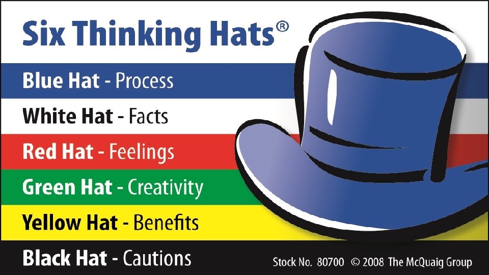 O The blue hat is the overview or process control. It is for organizing and controlling the thinking process so that it becomes more productive. The blue hat is for thinking about thinking. In technical terms, the blue hat is concerned with meta-cognition. O Look not at the subject itself but at the 'thinking' about the subject O Set the agenda for thinking O Suggest the next step in the thinking, " I suggest we try some green hat thinking to get some new ideas" O Ask for a summary, conclusion, or decision, "Could we have a summary of your views? " O The white hat covers facts, figures, data and information. Too often facts and figures are embedded in an argument or belief. O Wearing your white hat allows you to present information in a neutral and objective way. O What information do we have here? O What information is missing? O What information would we like to have? O How are we going to get the information?