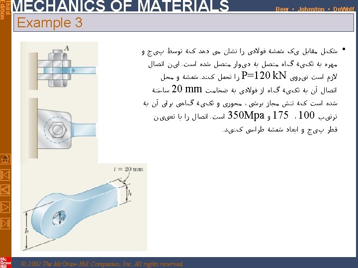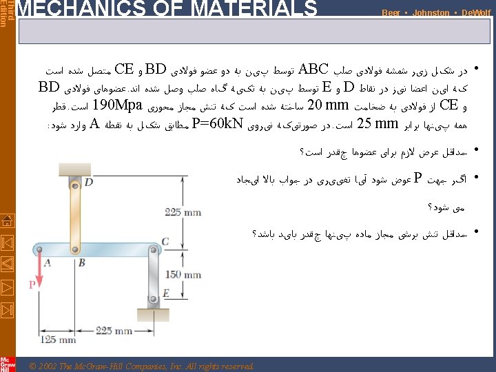 Third Edition MECHANICS OF MATERIALS Beer • Johnston • De. Wolf Design • Design of new structures requires selection of appropriate materials and component dimensions to meet performance requirements • For reasons based on cost, weight, availability, etc. , the choice is made to construct the rod from aluminum (sall= 100 MPa). What is an appropriate choice for the rod diameter? • An aluminum rod 26 mm or more in diameter is adequate © 2002 The Mc. Graw-Hill Companies, Inc. All rights reserved. 1 -8