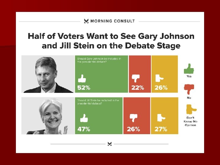 Access to Presidential Debates The Commission on Presidential Debates selects candidates basis party of theand following criteria: Is this on fairthe to third Independent candidates? Do we set theeligibility bar too high? 1. Evidence of Constitutional v v v Must be at 35 years of age; Must be natural born citizen, and a resident of the U. S. for at least 14 years; Must be otherwise eligible under the Constitution; 2. Evidence of ballot access v The candidate must qualify to have his/her name appear on enough state ballots to have at least a mathematical chance of securing an Electoral College majority; 3. Indicators of Electoral support v The candidate must have a level or support of at least 15% of the national electorate as determined by five selected national public opinion polling organizations;