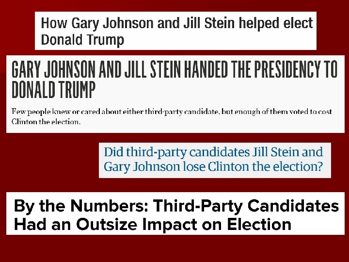 Why do third parties do well in some years and not in others? They are a response to major party failure: 1. They raise issues the two major parties have ignored. 2. They are vehicles for discontent. They certainly became that in 2016!