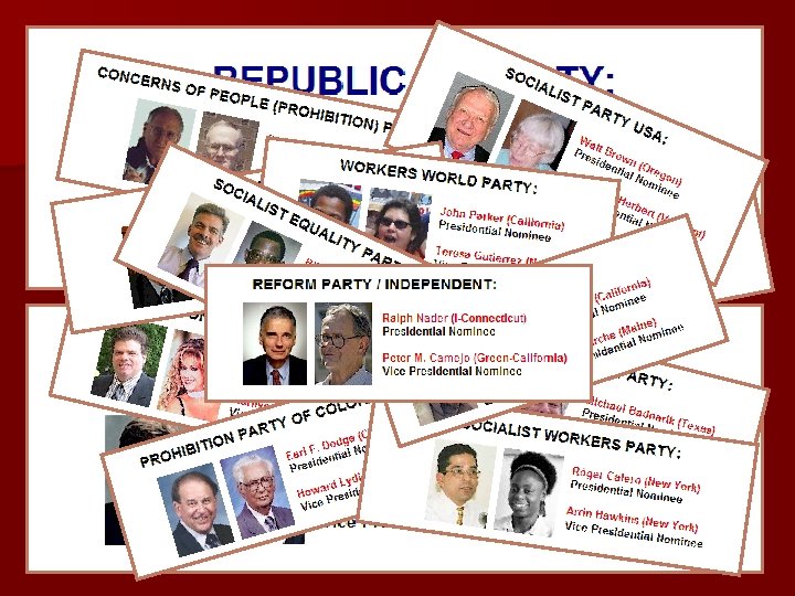 Third Party Year % of Popular Vote Electoral Votes Fate in Next Election Anti-Masonic 1832 7. 8 7 Endorsed Whig candidate Free Soil 1848 10. 1 0 Received 4. 9% of vote Whig-American 1856 21. 5 8 Party dissolved Southern Democrat 1860 18. 1 72 Party dissolved Constitutional Union 1860 12. 6 39 Party dissolved Populist 1892 8. 5 22 Endorsed Democratic candidate Progressive (T. Roosevelt) 1912 27. 4 88 Returned to Republican party Socialist 1912 6. 0 0 Received 3. 2% of vote Progressive (La. Follette) 1924 16. 6 13 Returned to Republican party States’ Rights Democrat 1948 2. 4 39 Party dissolved Progressive (H. Wallace) 1948 2. 4 0 Received 0. 2% of vote American Independent 1968 13. 5 46 Received 1. 4% of vote John B. Anderson 1980 7. 1 0 Did not run in 1984 H. Ross Perot 1992 18. 9 0 Received 8% of vote Ralph Nader 2000 2. 7 0 Received 0. 4% of vote