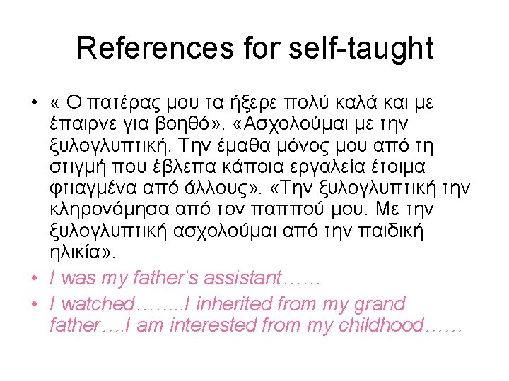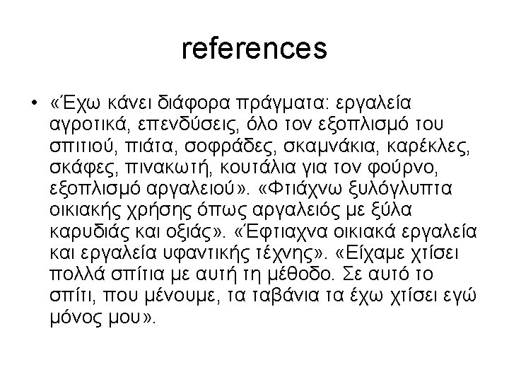 Methodology Interactive interviewing-Pomaks asked to verbally described their experiences of phenomenon § 3 rd reading: The inclusion of the work in the historical – social environment of the Pomaks as far as the formation and the revelation of the regional or state identity are concerned. Ø Do they claim their participation in exhibition as active citizens? Ø Do they demonstrate their work in their own region or in other regions? Ø How do they identify themselves in the interviews? Folk artisans, craftsmen? European? Thracian? Other?