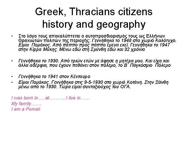 The research material In this historical research we used as sources/traces: Ø the words of the informants (interviews) Ø ddigitalized material (works of the artists/craftsmen) Ø the activities in the laboratory (on-site observation) Ø related published literature (direct and indirect material) § We have 33 interviews in total and 112 of them refer to their self determination as citizen of the country, of Europe. § We have 5 interviews of Pomaks in a total of 33 and twenty-five of them refer to their self determination as citizens of the country, of Europe.