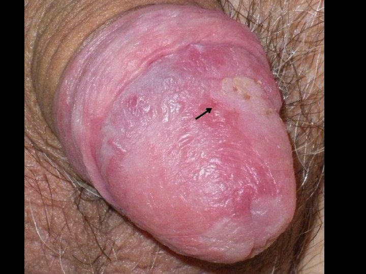 This 60 year old gentleman attended the sexual health clinic giving a long standing history of recurrent glans penis soreness and itching. He had been treated with clotrimazole and hydrocortisone cream intermittently with some relief from his symptoms, but they always reoccurred. On examination he had several raised thin pale plaques, which looked very much like HPV (warty). He was treated with aldara and asked to return for review. Unfortunately he didn't come back for a year. There had been some response to the aldara for the 4 weeks he used it. When he was re-examined the plaques were still present but there was a tiny ulcer, which he said had been there for 6 months. (arrowed in the picture).