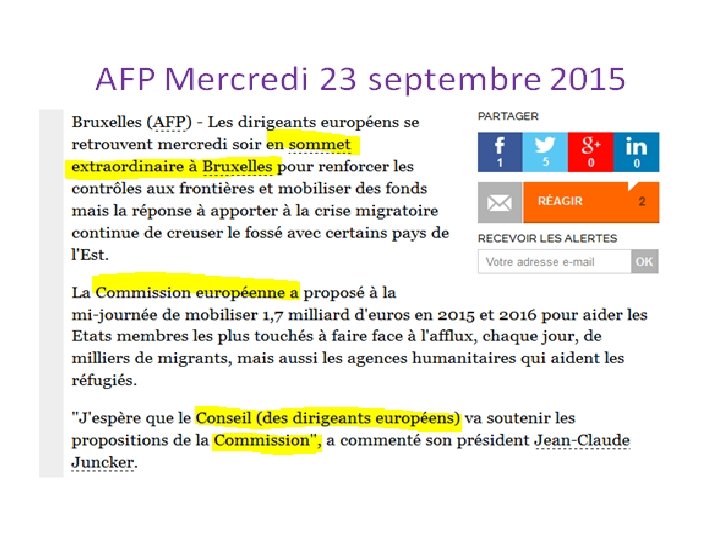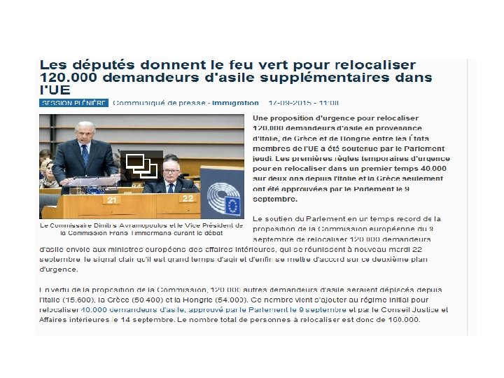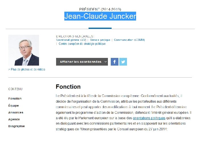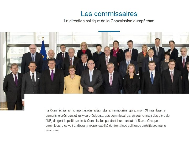 La commission européenne Son siège est situé à Bruxelles. Elle est composée d'un commissaire par État membre, soit 28 commissaires Son président actuel est le portugais Jean-Claude Juncker. Son mandat est de cinq ans. Les commissaires sont assistés par une administration centrale qui est, par ses effectifs (27 000 personnes environ en 2007), la plus importante de l’Union européenne. Sa fonction principale est de proposer et de mettre en œuvre les politiques communautaires. Elle est aussi « Gardienne des traités » , elle veille à leur application Elle partage les pouvoirs exécutif et législatif avec le Conseil des ministres.