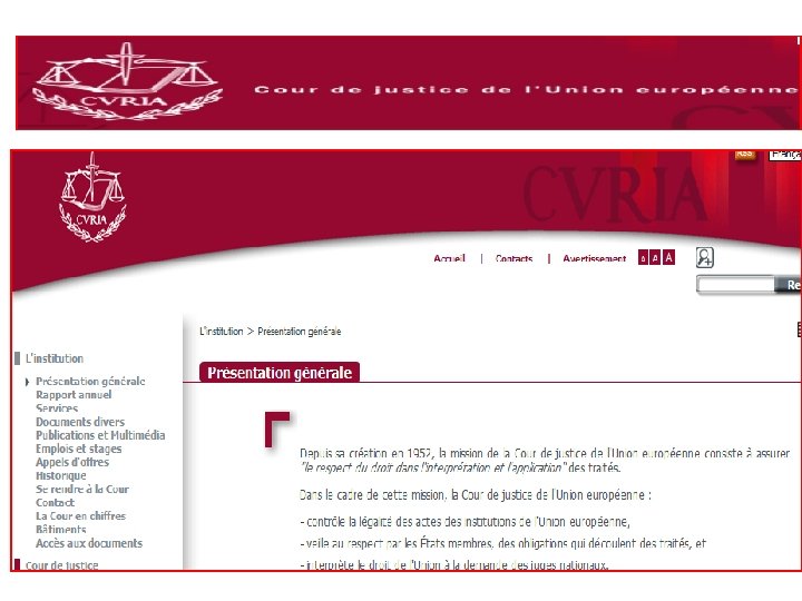 La cour de justice de l’union européenne La Cour de justice de l’Union européenne (CJUE) est l’institution juridictionnelle de l’UE dont la mission consiste à assurer « le respect du droit dans l’interprétation et l’application La CJUE : • • • des traités » . contrôle la légalité des actes des institutions de l’Union européenne veille au respect, par les États membres, des obligations qui découlent des traités interprète le droit de l’Union à la demande des juges nationaux = l’autorité judiciaire de l’Union européenne qui veille à l’application et à l’interprétation uniforme du droit communautaire. Siégeant à Luxembourg, elle comprend • • La Cour de justice Le Tribunal Les décisions de sont obligatoires et exécutoires sur le territoire des États membres. La CJUE est compétente pour les recours initiés par les États ou les institutions européennes. Le Tribunal est chargé en première instance de tous les recours intentés par des personnes physiques ou morales ainsi que des recours formés contre des décisions des tribunaux spécialisés. À noter : la Cour de justice de l’Union européenne (CJUE) ne doit pas être confondue avec la Cour européenne des droits de l’homme (CEDH) qui dépend du Conseil de l’Europe , ni avec la Cour internationale de justice (CIJ) de La Haye qui est un organe de l’Organisation des Nations unies (ONU).