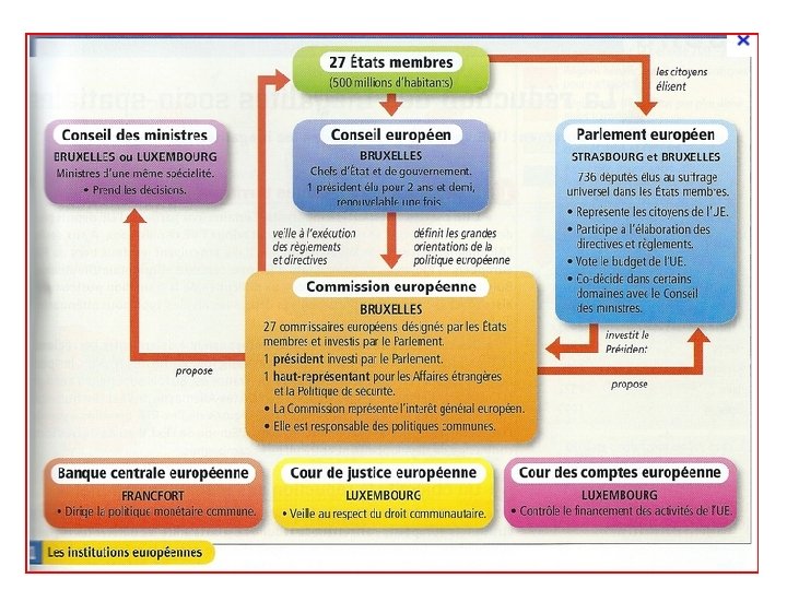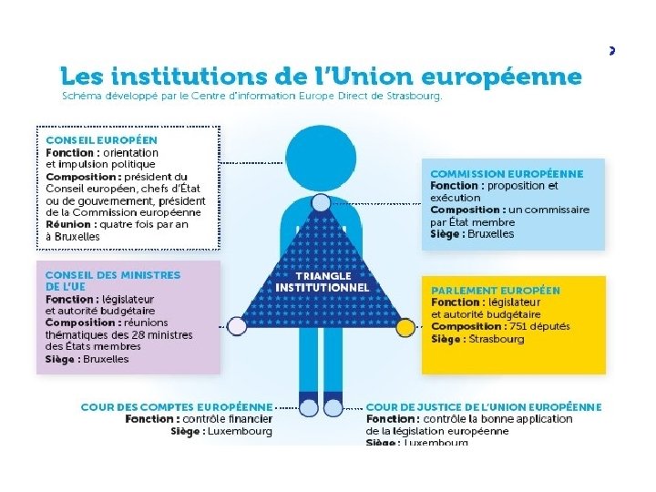 Les principales institutions politiques européennes ü Le Conseil Européen aussi appelé « Sommet » ü Le Parlement ü Le Conseil des ministres ou conseil de l’union européenne ü La Commission Européenne ü La Cour de justice de l'Union européenne ü La Banque Centrale Européenne ü La Banque Européenne d’Investissement