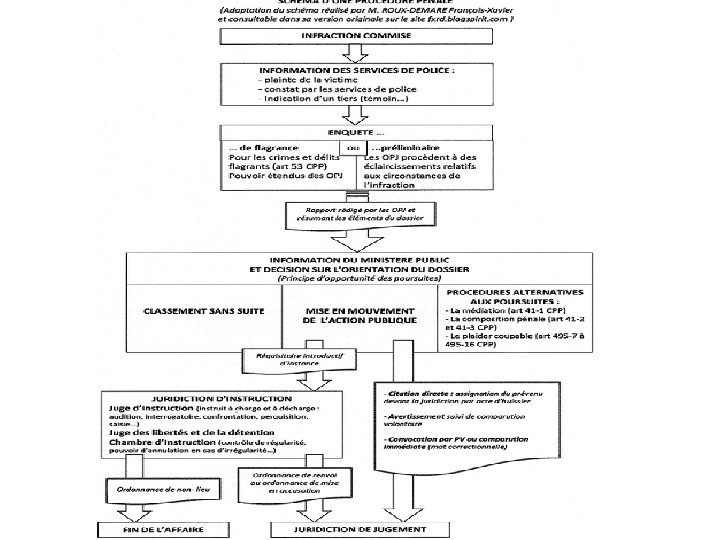 II La justice pénale est chargée de juger et de punir les infractions à la loi. Une infraction est une action répréhensible prévue et réprimée par une loi pénale. Celui qui l’a commet est jugé par la justice pénale et encourt des sanctions (voir suite) Comment aller en justice pénale ? Le déclenchement d’une procédure judiciaire pénale, peut être mis en œuvre soit par le procureur de la République, soit directement par la victime qui subit personnellement et directement un préjudice physique, moral ou matériel, du fait d’une infraction pénale. 2. 1 L’action publique est l’ action principale au procès pénal Cette action est exercée par le ministère public qui défend l’intérêt général. Une juridiction ne peut se saisir elle-même, le déclenchement des poursuites se fait par le Ministère public (Parquet) qui veille au respect de l’ordre public et à l’application de la loi). Le procureur reçoit les plaintes et dénonciations, et il est aussi informé des infractions par les OPJ Après l’enquête le procureur de la République prend une décision sur l’action publique il décide de l’opportunité des poursuites : Ø Ø il peut classer l’affaire sans suite, si elle ne lui semble pas mériter de traitement judiciaire il peut saisir un juge d’instruction si l’affaire est grave ou complexe et nécessite une enquête approfondie il peut saisir une juridiction de jugement, s’il estime que les faits sont constitutifs d’une infraction ; il peut enfin mettre en œuvre une solution alternative aux poursuites : le classement de l’affaire est alors soumis au respect par le mis en cause de certaines conditions (rappel à la loi, participation à une médiation, paiement d’une somme à titre de composition pénale, etc. ). Le procureur exerce seul l’opportunité des poursuites, il n’est donc pas lié par l’existence d’une éventuelle plainte.