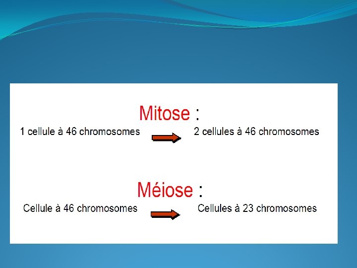 La méiose Deuxième division - équationnelle C'est la division équationnelle de la méiose. Elle a toutes les caractéristiques de la mitose, mais n'est pas précédée d'une interphase. Elle produit à partir de chaque cellule à n chromosomes doubles, deux cellules à n chromosomes simples. . (Source: http: //www. maxicours. com/se/fiche/1/8/408481. html/ts)