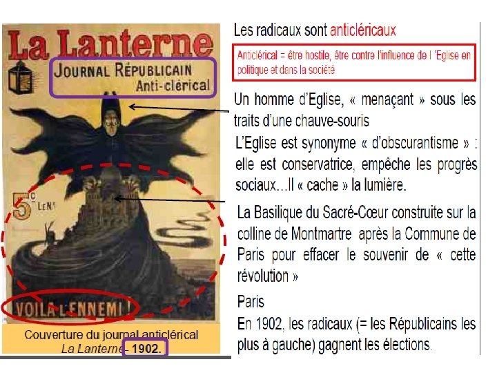 - le personnage central : c’est une République sûre de sa force qui renverse ceux qu’elle considère comme ses ennemis ; autour du personnage central, les Lumières (le flambeau), les droits de l’Homme, le suffrage universel → les références à la RF sont évidentes, la République est fille de la Révolution ; toutes les classes sociales sont représentées. Cette foule encadre le personnage central dans un élan de générosité, de fraternité, d’égalité ; - au premier plan, les ennemis de la République : le comte de Chambord, héritier des Bourbons, Napoléon III, etc. certains mots peuvent être mis en avant : charte, droit divin…