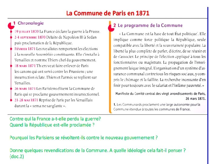 2)Face au gvt de Thiers, installé à Versailles, le petit peuple de Paris se soulève en mars 1871 et proclame la Commune de Paris. La répression est sanglante. (25 000 morts). Mais la Répub. a montré qu'elle pouvait défendre l'ordre