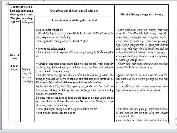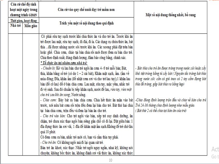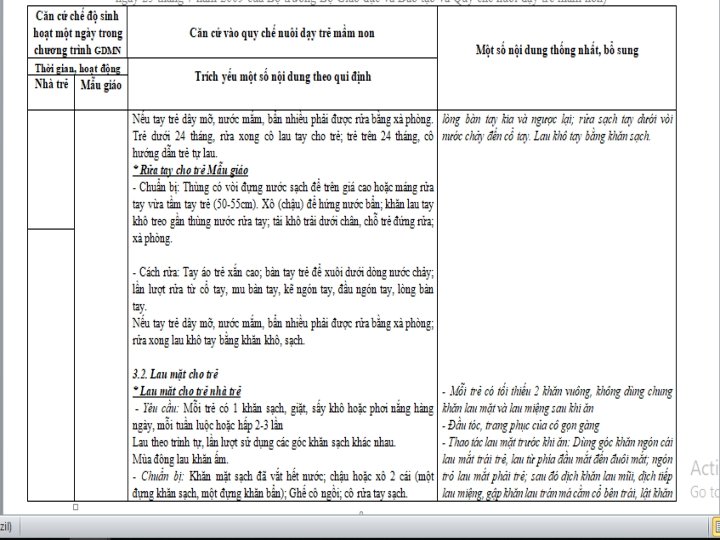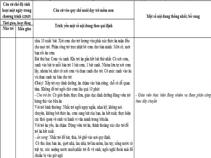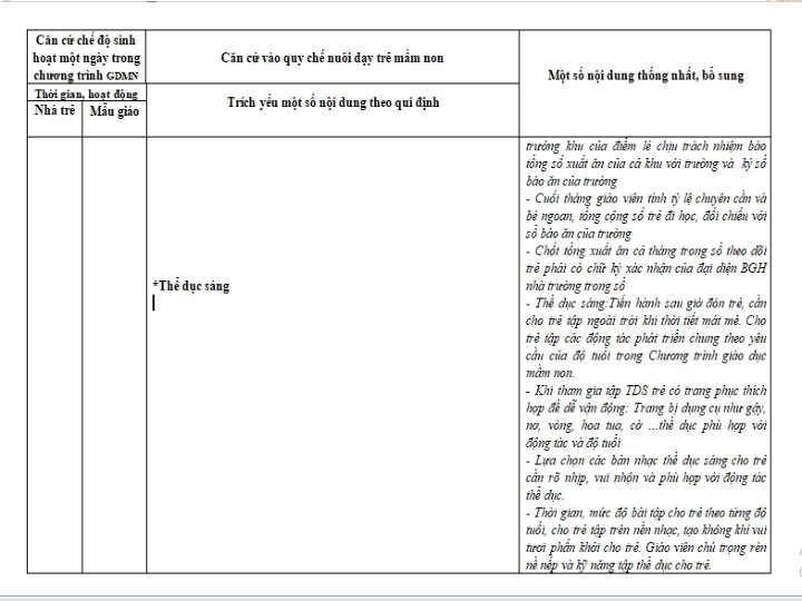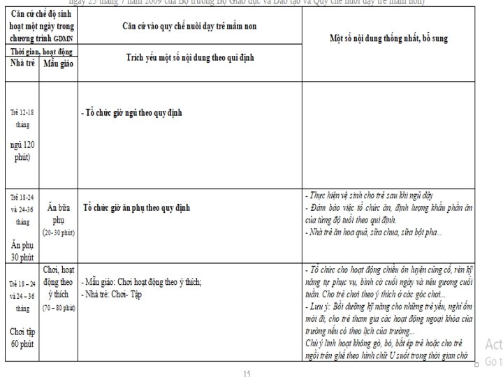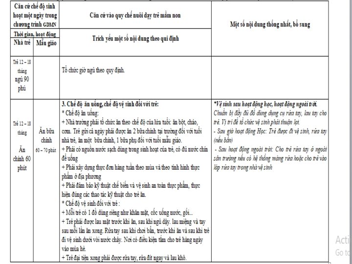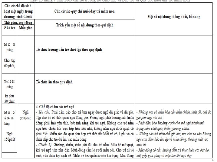 MỘT SỐ NỘI DUNG BỔ SUNG THỰC HIỆN QUY CHẾ CHUYÊN MÔN THEO CHẾ ĐỘ SINH HOẠT MỘT NGÀY TẠI CƠ SỞ GDMN (Ngoài các quy định theo chế độ sinh hoạt một ngày trong chương trình GDMN ban hành kèm Thông tư số 17/2009/TT- BGDĐT ngày 25 tháng 7 năm 2009 của Bộ trưởng Bộ Giáo dục và Đào tạo và Quy chế nuôi dạy trẻ mầm non)