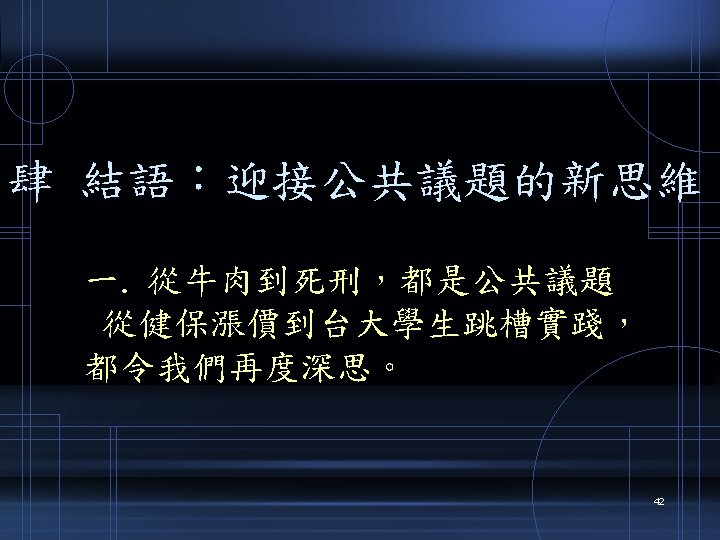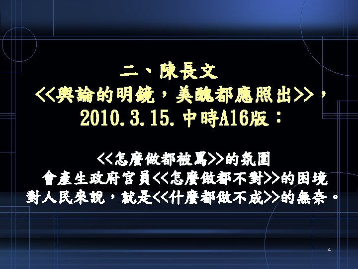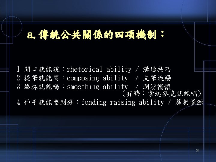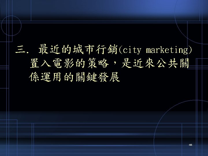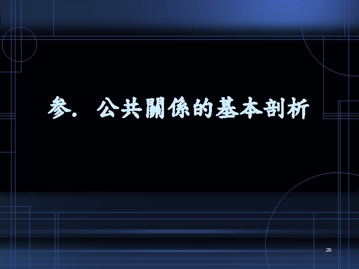 Thomas Jefferson government without newspaper without government 3 Slides: 46 Download presentation 一、美國總統Thomas Jefferson: government without newspaper without government 3 媒體 to inform / to educate / to entertain / to issue-setting 8 三. 漏斗原理(filtering theory) 發生的 happenings 注意的 noticed 報導的 reported 越 來 越 少 編輯的 edited 接收的 received 22 四. 選擇性的運用 選擇性暴露 (selective exposure) 選擇性記憶 (selective memory) 選擇性注意 (selective attention) 選擇性再注意 (selective retention) 23 五. 媒體特性多元, 但宜特別注意兩點突顯: what looking good > what doing good 〈what abnormal > what normal 〉 24 ex:出兵伊拉克 supporting our policy supporting our kids 28 a. 2000沈莒達的5 PRS: Public Relations 30 2. 5 PRs 1. 定位正確(position right) 定位大師Jack Trout (1997)The New Position (1999)The Power of Simplicity 32 ex: Nyquil:night-use <<用途定位>> 7 -up:non-cola / non-coffee <<成分定位>> 33 3 公共傳播(public release) 公共關係相當注重公共服務文本(PSA: Public Service Announcement )的提供,如同人去 應徵的resume / 介紹單位的briefing 36 ex: pencils來表示 publications 出版品 events 事件 news 有利報導 community involvement activities 社區參與活動 identity media 識別性媒介 logo 標誌 social responsibility activities 社會責任運動 37 4 流程利得(process revenue) 找尋策略甜區(strategy sweet spot, SSS) 顧客需求 事業體能力 SSS 產品優勢 39 二. 智利 8. 8級地震, 智利總統 Michell Bachelet說: The power of nature has again struck our country. We are trying by every means possible to bring the country back to normal. 43 四. 從五u去體會複雜中的務實 useful unique upgrade unite update 45