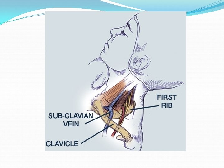 Surgical Anatomy: (cervicoaxillary canal) The scalinus anticus which inserts in the first rib divids the costoclavicular space into: ----anteromedial part containing the subclavian vein ----postro lateral part (scalene triangle); contains the br. Plexus and subclavian artery