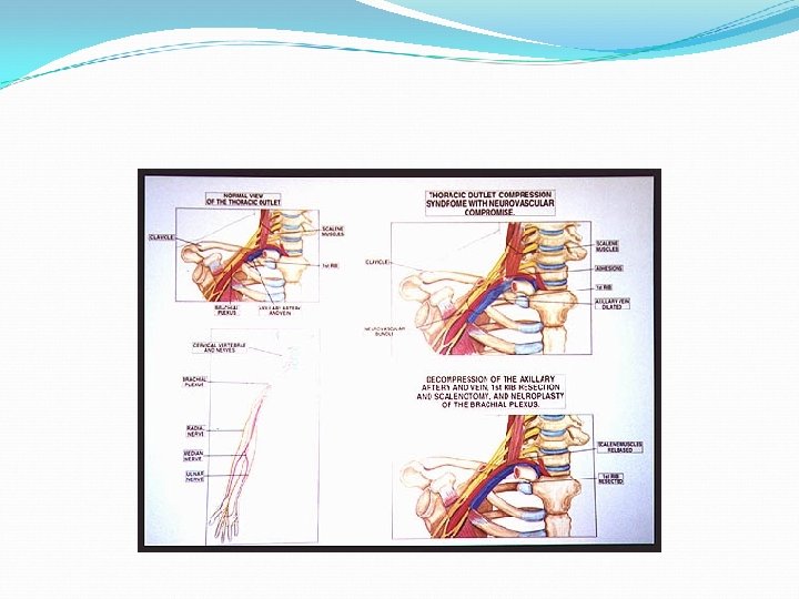 Investigations: 1. plain x – ray neck and chest: cervical rib, prominent transverse process or abnormal clavicle 2. CT chest and neck 3. nerve conduction velocity (NCV) 4. EMG (electromyography) 5. Doppler study 6. arteriography