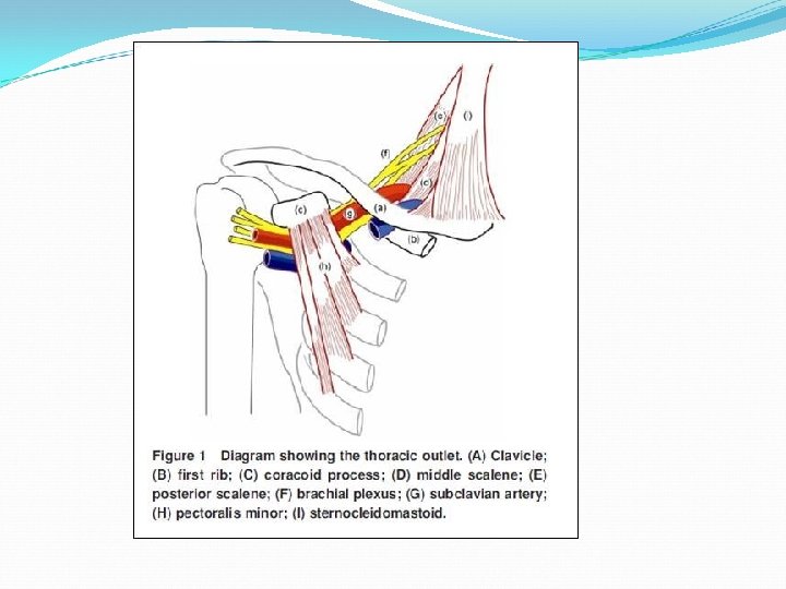 Other names: (according to the presumed etiology): 1. Scalene syndrome. 2. costoclavicular syndrome. 3. hyperabduction syndrome, and 4. cervical rib syndrome Whatever the name and etiology most compressive factors operate against the first rib.