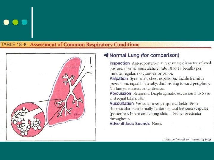Developmental Considerations ¢ Infants l While infant is sleeping, can inspect and auscultate the lungs • Infants normally have a rounded thorax, reaching a 1: 2 (anteroposterior to transverse) diameter by age 6 • If a barrel shape persists after age 6, possible chronic asthma or cystic fibrosis l ¢ ¢ If baby begins to cry, it actually enhances the palpation of tactile fremitus Pregnancy l Wider thoracic cage Aging l Kyphosis – outward curvature of thoracic spine l Calcification of costal cartilages leading to less mobility