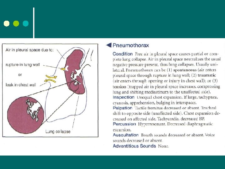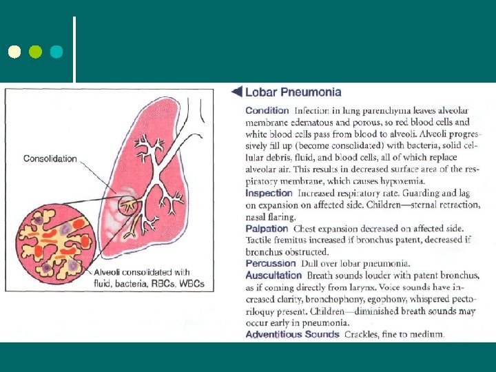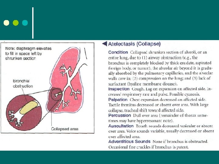 Auscultation ¢ Abnormal Findings l Decreased breath sounds • Obstruction of bronchial tree (by secretions, mucous plug, foreign body) • In emphysema due to loss of elasticity in the lung fibers and decreased force of inspired air. The lungs are already hyperinflated so not much air will be coming in. • Obstruction of sound by pleural thickening • Silent chest – no air moving in or out l Increased breath sounds – louder than normal • Bronchial sounds • Heard in abnormal location, such as periphery • High pitched, with prolonged expiratory phase • Occur in consolidation (pneumonia) or compression (fluid in intrapleural space). Dense lung tissue enhances transmission of sound.