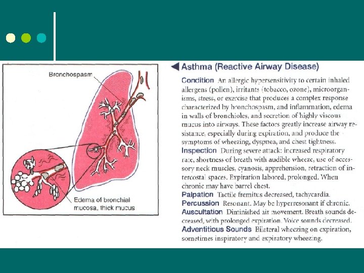 Wheeze l Description • High pitched musical squeaking sound predominantly during expiration l Mechanism • Air squeezed or compressed through narrowed airways (collapsing, swelling, secretions, tumors) l Clinical example • Acute asthma or chronic emphysema