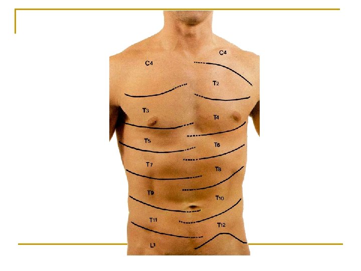 The segmental innervation of anterior surface of trunk n n n T 2-sternal angle T 4- nipple T 6-xiphoid process T 8-costal arch T 10-umbilicus T 12-midpoint between umbilicus and symphysis pubis
