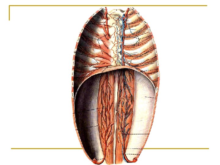 Intercostales externi n n Origin: lower border of riⅡ) Insertion: upper border of rib below origin Action: elevate ribs adding in forced inspiration Replaced anteriorly by external intercostals membrane. Intercostales interni n n Origin: upper border of rib Insertion: lower border of rib above origin Action: depress ribs forced expiration Replaced posteriorly by internal intercostals membrane.