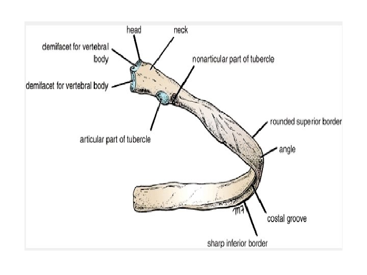 THE RIBS: ☻ Arranged in twelve pairs ☻Posteriorly it articulates with the thoracic vertebra ☻Anteriorly joins with the sternum through their respective costal cartilages directly or indirectly
