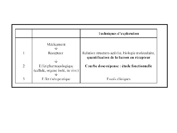 La courbe dose-action d’un agoniste permet de définir: l’efficacité et la DE 50. La comparaison des courbes dose-effet de plusieurs agonistes permet de les classer en comparant leur puissance et leur efficacité.