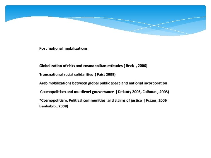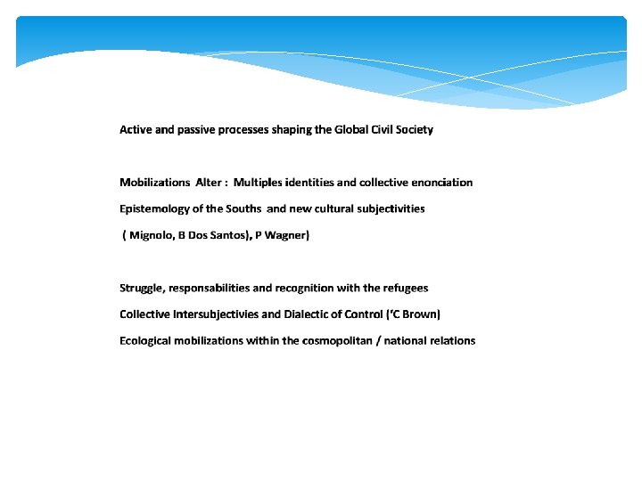 European discourses, European narrations Globalization , counterpower and altermondialization Humanistic criticism x Intellectual criticism Public spaces in connection Social forum and arena Multiple Identities and collective enunciation Globalization, Europeanization and cosmopolitism
