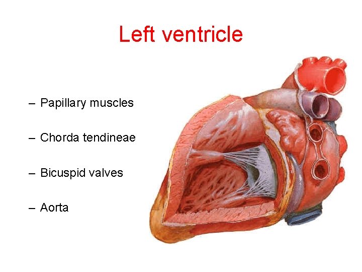Left ventricle • – Papillary muscles – Chorda tendineae – Bicuspid valves – Aorta Papillary muscles – Chorda tendineae – bicuspid valves – Aorta –