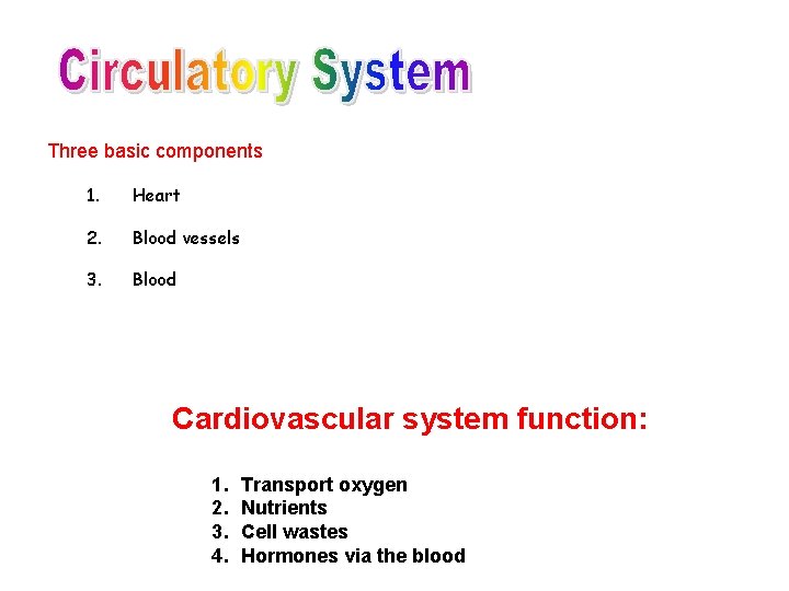 Three basic components 1. Heart 2. Blood vessels 3. Blood Cardiovascular system function: 1. 2. 3. 4. Transport oxygen Nutrients Cell wastes Hormones via the blood