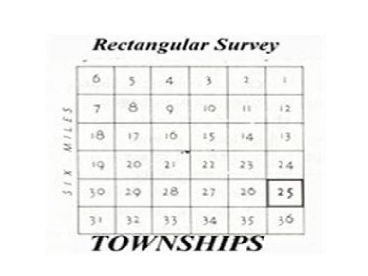 Township and Range 1. Thomas Jefferson 2. Used after the Louisiana Purchase (1803) 3. Geometric and use of longitude and latitude 4. West of Mississippi River