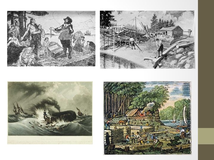 New England: Environment and Economy F. F. L. S • • • Environment Had the coldest climate of the three regions. Long winters and short summers Rocky soil not suitable for large farms Thick forest Rich fishing grounds Fishing- Commercial fishing became a source of income for the New Englanders. The vast fishing ground located in the North Atlantic provided a source of wealth for these settlers. Fur Trapping- the vast forest was full of beaver that could be trapped and their fur could be sold for profit. Lumber- the forest also provided a nearly endless supply of lumber to be sold to England, and used to build ships to help the growing fishing industry. Shipbuilding – the lumber taken from New England forest was ideal for shipbuilding.