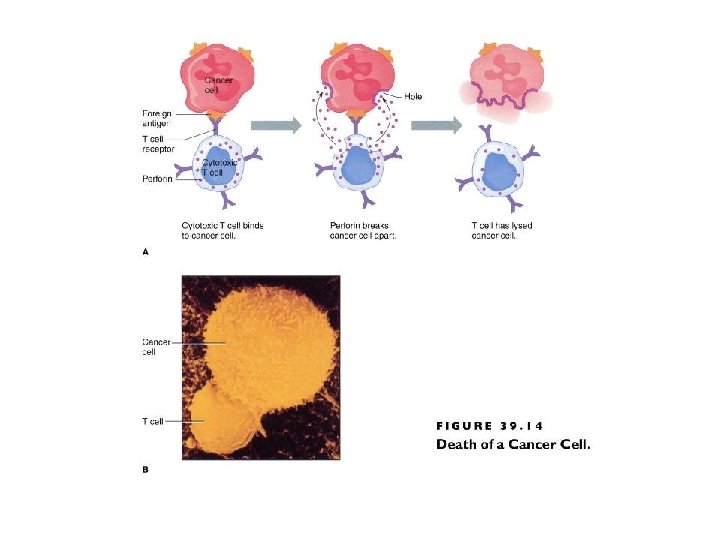 Types of T Cells • Helper T (TH) cells release cytokines to stimulate B cells to make antibodies and present antigens • Cytotoxic T cells (Tc) kill cells by poking holes in membrane or triggering cell suicide (apoptosis)