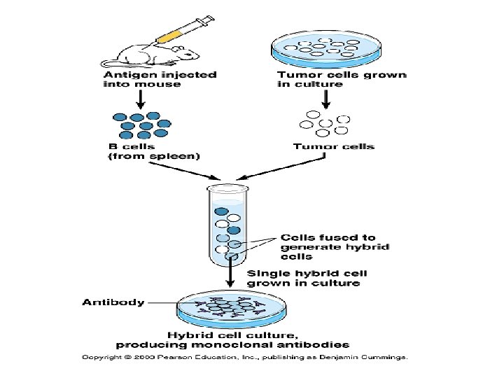 Monoclonal Antibodies 單株抗體 • Manufactured antibodies against tumorspecific antigens • First created by fusing antigenproducing B cells from mice with cells from B cell tumors • Now made in genetically engineered cells