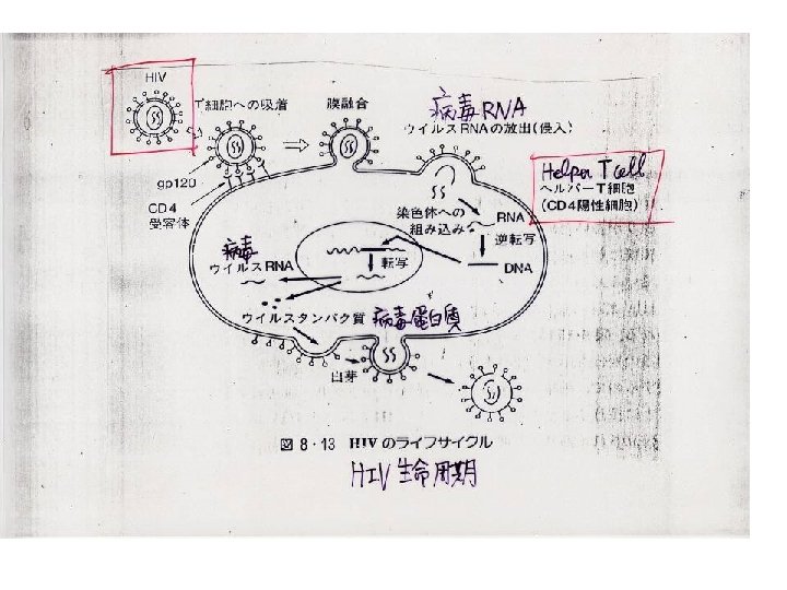HIV Replication (1) • RNA retrovirus • A protein (gp 120) at virus surface binds to host cells with CD 4 receptors • These receptors occur on helper T cells • Once bound, RNA and viral enzymes enter the host cell