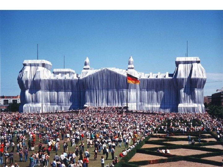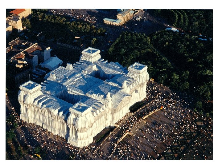 Christo and Jeanne Claude. Wrapped Reichstag. Berlin. 1971 -1995 • Christo and Jeanne-Claude: Projects such as the running fence and Wrapped Reichstag live on afterwards in preparatory sketches, photographs, books, and film. Their art is not just the end result, but the entire process from planning through dismantling, including the way it energizes people and creates relationships