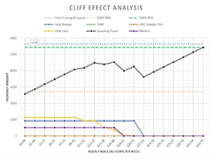Cliff Effect v Pay increase of less than $50 a month can lead to the loss of several hundred dollars’ worth of work support programs. v When the gain in income doesn’t cover needs. . . job, raise, or promotion turned down v Creates motivation barrier • fear of losing benefits • Inability to earn enough income to cover basic need expenses