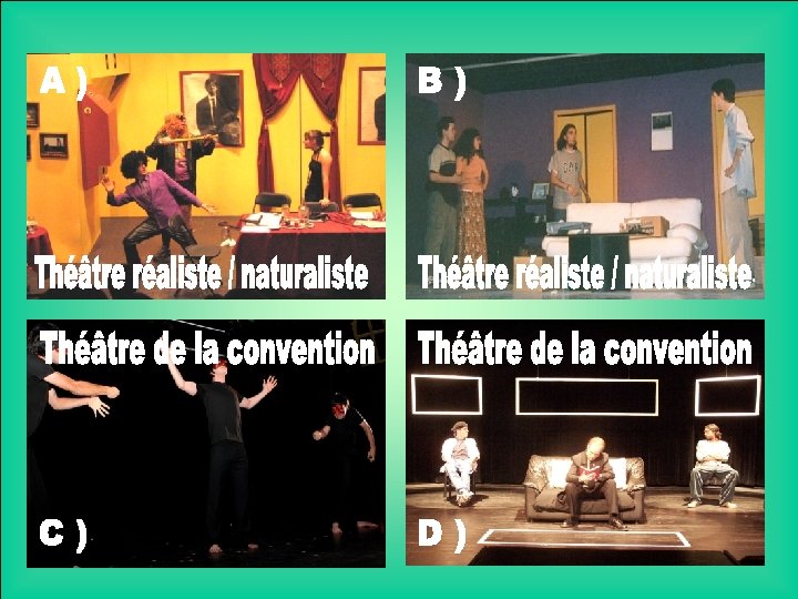 ACTIVITÉ À l’aide des notions vues en classe, dressez une liste d’éléments qui vous permettent d’identifier à quel courant théâtral chacune des images suivantes appartient.