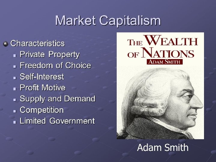 Market Economy=Free Market Economy= Capitalism -Adam Smith, a Scottish Enlightenment thinker, is considered a founder of capitalism. His famous book is called The Wealth of Nations (1776) -based on the philosophy of Laissez Faire (government keeps its hands out of the economy as much as possible). -the economy functions through supply and demand. -high competition between businesses.