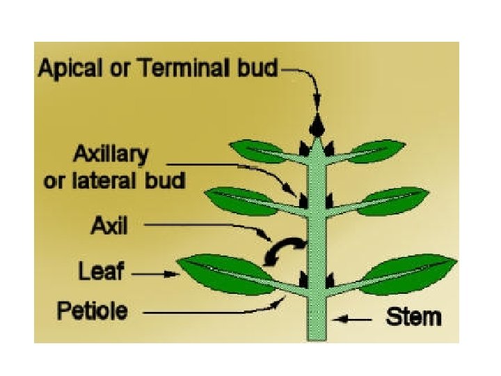 Structures in the Stem • Terminal Buds - Underdeveloped shoot at the tip of a stem • Auxiliary buds - Underdeveloped shoot where petiole (joins stem to leaf) meets the stem • Apical Shoot Meristem - Cell growth at the tip of the stem