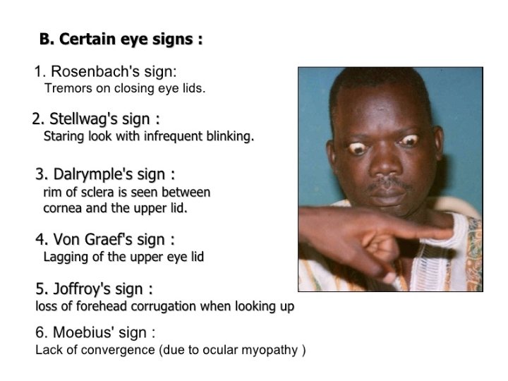 Clinical features • General : weight loss, tremors, heat intolerence, sweating, goitre, apathy, fatigue. • CVS: increased CO with tachycardia, arrhythmias (commonly atrial) and palpitations, a hyperdynamic circulation, increased myocardial contractility and cardiomegaly. • Respiratory : Dyspnea • GIT: diarrhea, N & V • CNS: anxiety, Irritability, insomnia. • Neuromuscular : proximal neuropathy, muscle weakness. • Ophthalmic: lid lag, lid retraction, reduced blinking, exophthalmos, corneal ulceration. • Reproductive : amenorrhea, oligomenorrhe a, infertility.