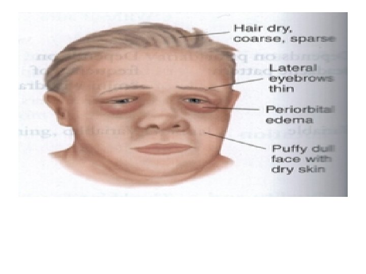 1. • • 2. • • 3. Signs and symptoms General : Weight gain Cold intolerance Fatigue , somnolence Hoarseness of voice GIT: constipation, ileus, ascitis CVS: Decrease BP, HR, CO, contractility, Increase PVR, Congestive heart failure, Cardiomyopathy, pericardial effusion, Altered baroreceptor function 4. Respiratory: Maximum breathing capacity and diffusion capacity are decreased, and ventilatory responsiveness to hypoxia and hypercarbia is depressed. 5. Hematological : anemia. 6. Neurological : depression, psychosis, delayed relaxation of tendon reflexes, cerebellar ataxia, myotonia. 7. Reproductive : menorrhagia, infertility. 8. Dermatalogical : myxoedema, purplish lips, malar flush. 9. Ocular : periorbital edema