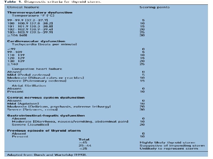 Thyroid storm • It is an abrupt exacerbation of hyperthyroidism caused by excessive release of thyroid hormones into the circulation • Predisposing factors: • Medical factors Ø Infection, fever, uncontrolled toxicity Ø Improper treatment Ø Pregnancy Ø Anxious and nervous patients before surgery