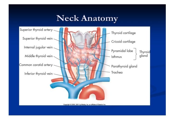 Anatomy of Thyroid gland • The thyroid gland weighs approximately 20 g and is composed of two lobes joined by an isthmus. • The gland is closely affixed to the anterior and lateral aspects of the trachea with the upper border of the isthmus located just below the cricoid cartilage. ( C 5 -T 1) • A pair of parathyroid glands are located on the posterior aspect of each lobe.