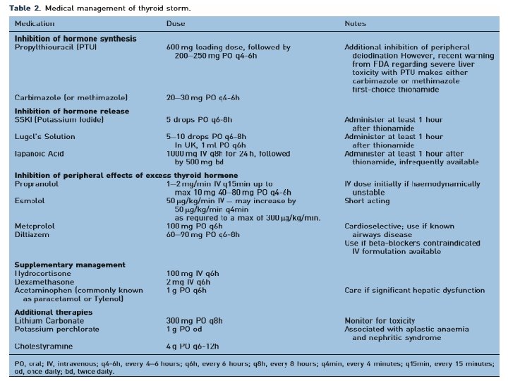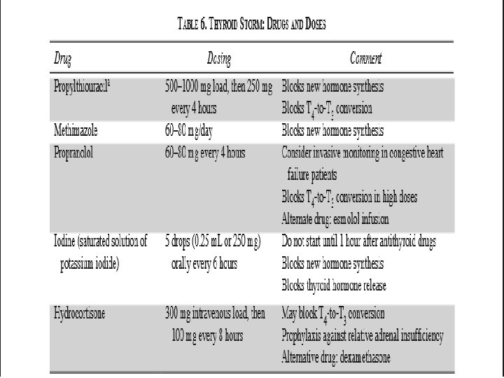 • Antithyroid drugs (PTU 200– 400 mg every 8 hours) may be administered through a nasogastric tube, orally, or rectally. • If circulatory shock is present, an intravenous direct vasopressor (phenylephrine) is indicated. • β-adrenergic blocker or digitalis is recommended for atrial fibrillation accompanied by a fast ventricular response. • Serum thyroid hormone levels generally return to normal within 24 to 48 hours and recovery occurs within 1 week. • Unfortunately, the mortality rate for thyroid storm remains surprisingly high at approximately 20%.