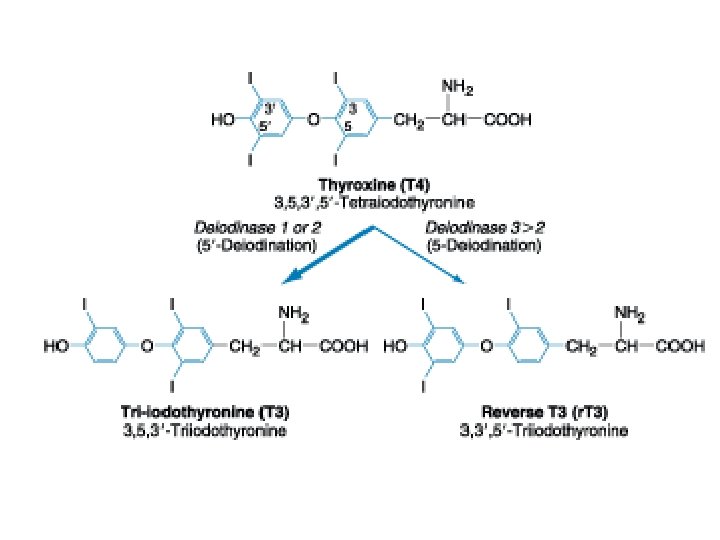 Deiodinases • In many respects, T 4 may be thought of as a precursor for more potent T 3 • T 4 is converted to T 3 by the deiodinase enzymes Type I deiodinase • Located primarily in thyroid, liver, kidney • Has a relatively low affinity for T 4 Type II deiodinase • Higher affinity for T 4 • Found primarily in pituitary gland, brain, brown fat, thyroid gland